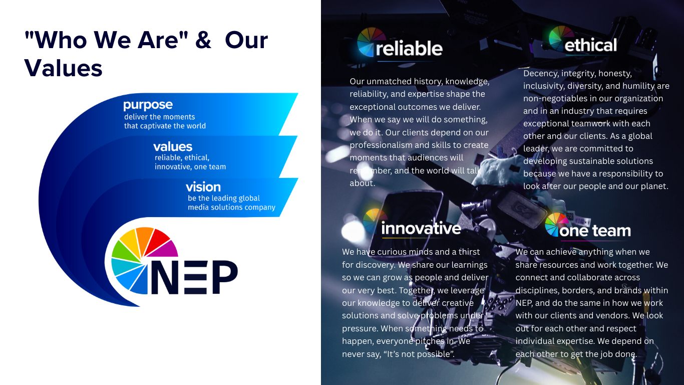 Unsere NEP-Werte leiten und prägen unser Handeln und spiegeln wider, was uns inspiriert, wer wir als Unternehmen heute sind – und wer wir in Zukunft sein wollen. Wir setzen darauf, dass jedes Teammitglied diese Werte lebt, damit wir gemeinsam die Inhalte unserer Kund:innen zum Leben erwecken können.
